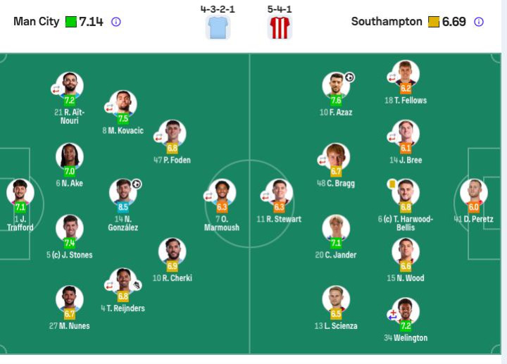 曼城首发:1-特拉福德、5-斯通斯、6-阿克、21-努里(71’33-奥赖利)、4-赖因德斯、8-科瓦契奇(58’26-萨维尼奥)、14-尼科·冈萨雷斯、27-努内斯、7-马尔穆什(71’9-哈兰德)、10-谢尔基、47-福登(58’11-多库)。